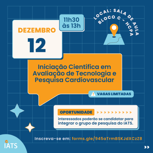 Iniciação Científica em Avaliação de Tecnologia e Pesquisa CardiovascularIatsNovembro 25, 2022Interessados poderão se candidatar para integrar o grupo de pesquisa do IATS No dia 12 de dezembro, das 11h30 às ... Leia mais