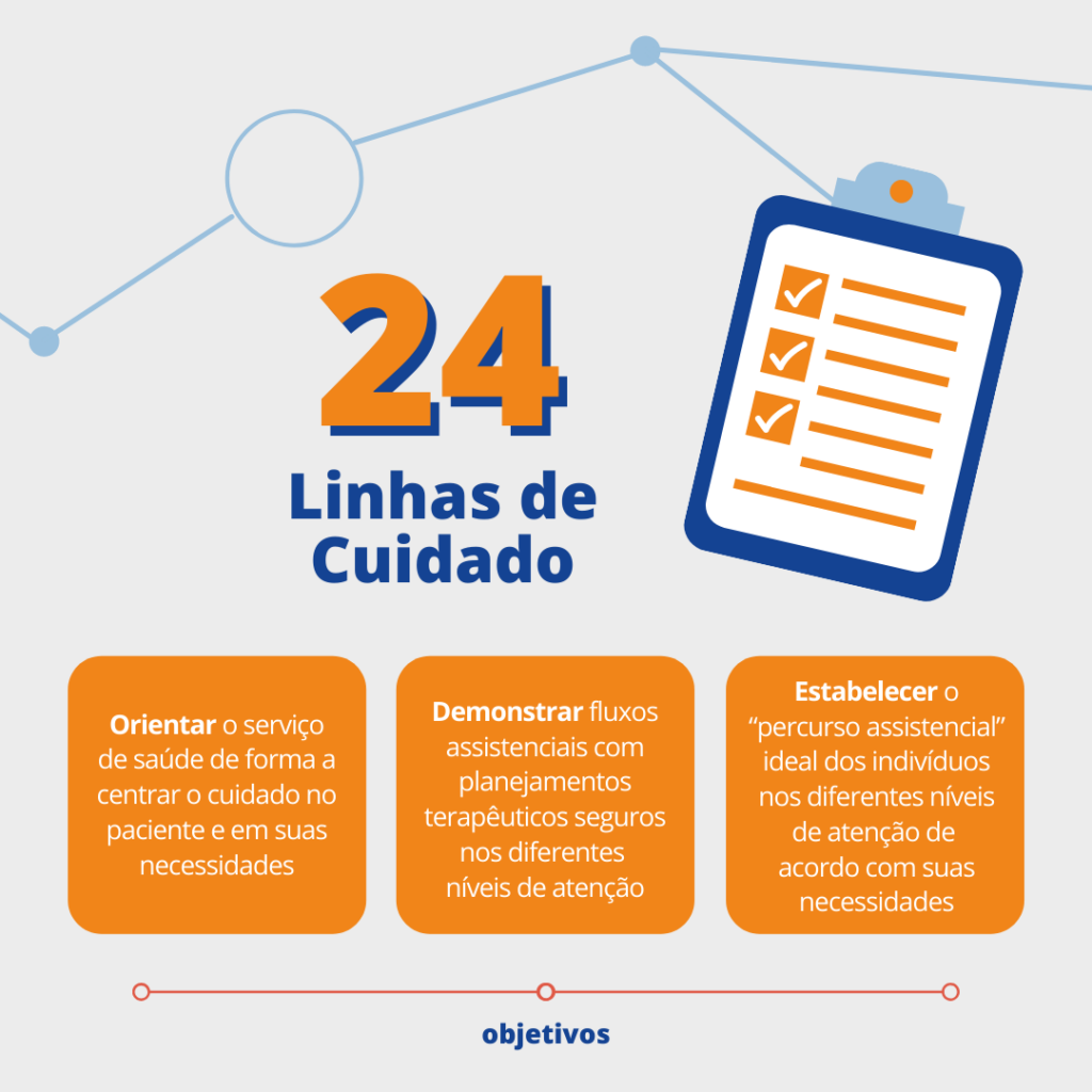 O projeto tem como objetivo ampliar o acesso da população aos serviços de Atenção à Saúde, com ênfase na qualidade assistencial por meio da implementação das linhas de cuidado. Para isso, foram desenvolvidos 24 materiais temáticos que orientam profissionais de saúde, gestores e cidadãos, padronizando a organização do atendimento no sistema de saúde e a trajetória adequada que o paciente deve percorrer nas redes de atenção à saúde.