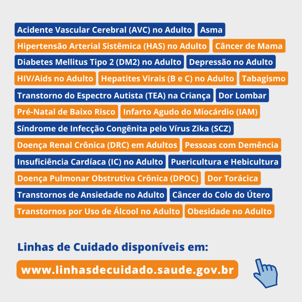 Atuando em conjunto com representantes do Ministério da Saúde, a equipe de trabalho do IATS foi composta por pesquisadores e profissionais com experiência clínica. Confira as linhas de cuidado desenvolvidas: Acidente Vascular Cerebral (AVC) no AdultoHipertensão Arterial Sistêmica (HAS) no AdultoDiabetes Mellitus Tipo 2 (DM2) no AdultoObesidade no Adulto, Câncer do Colo do Útero, Câncer de Mama, HIV/Aids no AdultoHepatites Virais​ (B e C) no AdultoTranstorno do Espectro Autista ​(TEA) na Criança, Pré-Natal​ de Baixo Risco, Puericultura​ e HebiculturaSíndrome de Infecção Congênita pelo Vírus Zika (SCZ)TabagismoDoença Renal Crônica ​(DRC) em AdultosDor Torácica, Insuficiência Cardíaca ​(IC) no Adulto, Doença Pulmonar Obstrutiva Crônica​ (DPOC), Infarto Agudo do Miocárdio​ (IAM), Depressão no Adulto, Transtornos por Uso de Álcool no Adulto, Pessoas com Demência, Transtornos de Ansiedade no Adulto, Asma e Dor Lombar.