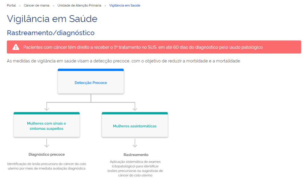 De acordo com a Linha de Cuidado já disponível no portal da iniciativa, o câncer de mama é o mais frequente entre as mulheres e também a principal causa de morte por câncer entre as mulheres no Brasil. Estima-se que 1 em cada 10 mulheres poderá desenvolver câncer de mama ao longo da vida. Embora infrequente, também pode acometer os homens (estimativa de 1 caso a cada 833 homens). Quanto mais precoce o diagnóstico, maior o potencial de cura com o tratamento.