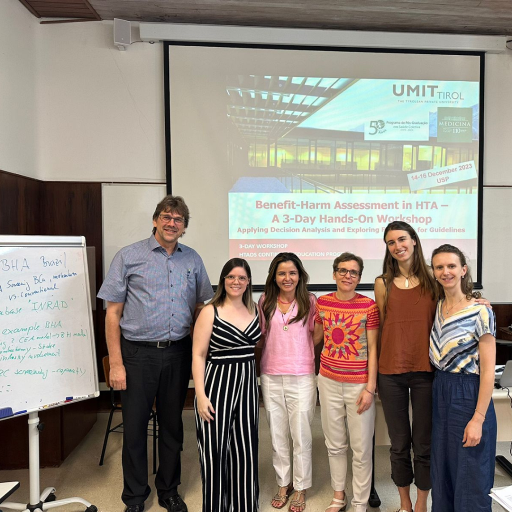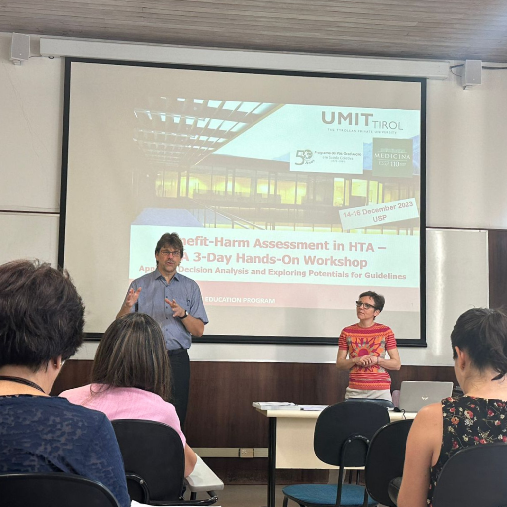Entre os dias 14 e 16 de dezembro, o Programa de Pós-Graduação em Saúde Coletiva da FMUSP, em parceria com a UMIT-TIROL, realizou o workshop presencial Benefit-Harm Assessment in Health Technology Assessments – a 3-Day Hands-On Workshop: Applying Decision Analysis and Exploring Potentials for Guidelines. O evento aconteceu na Faculdade de Medicina da Universidade de São Paulo – FMUSP e teve como proposta fomentar o uso de abordagens estruturadas, objetivas e transparentes para avaliação de benefício-risco para tomada de decisão em estudos de ATS no Brasil. A capacitação foi ministrada pelos renomados Professores Uwe Siebert, Beate Jahn e Julia Santamaria da UMIT-TIROL.